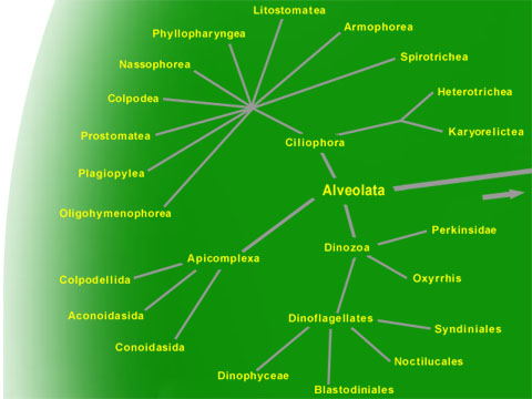 All Alveolata have (and derive their name from) a cellular feature called the cortical alveoli. These are tiny flattened 'bubbles' fused into a continuous layer that encompasses the cell, underlying and supporting the cell membrane. The cortical alveoli often form a flexible 'skin' or pellicle and can sometimes produce armor plates. Alveolates have cilia hairs (or distinctly structured flagella). They have tubular mitochondria. Like the other Chromalveolata kingdoms, many Alveolates have photosynthesizing chloroplasts apparently acquired from an absorbed symbiotic alga. However, only the relatively 'advanced' groups have these, which once raised questions about Alveolate classification. But the similarities between the three main groups of Alveolata, first noticed some years ago, has now been confirmed by genetic studies. It appears that the Dinozoa and Apicomplexa are more closely related to each other than to the Ciliophora. Both have chloroplasts and distinctive bundles of microtubules used for eating.