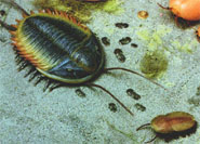 Trilobites (left) primitive arthropods that first appeared in the Cambrian, crawled on Earth's seafloors for the next 300 million years. (Image: U. of Wisconsin) |