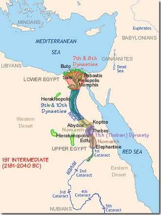 | The nomarchs struggled to control, irrigate and feed their own provinces. Some were more successful than others. While some nomarchs still officially recognized the remnant of the Old Kingdom in Memphis and the kings of the 7th and 8th Dynasties, others proclaimed themselves kings in their own right. Around 2150 BC, the nomarchs of Herakleopolis - descended from Neferkare (2150? BC) - successfully proclaimed their own dynasties, the 9th and 10th, and claimed royal prerogatives. Their influence extended as far south as the nomes of Abydos and Koptos. Here they were challenged by the growing power of the nomarchs of Thebes in Upper Egypt, descended from Antef I Inyotef (2100s? BC), who founded the 11th Dynasty. Other less-powerful nomarchs, while having some degree of independence, attached themselves to either the Heracleopolitan or the Theban dynasties. A clash between the two rival dynasties was inevitable.