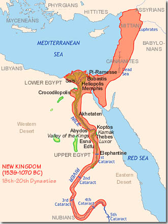 | Internally, the local nome governors that had opposed both the Hyksos and the 17th Dynasty were brought to heel. Those that survived became royal administrators and their lands passed to the throne. Centralized administration of the Nile Valley resumed. Agricultural production soared. The spoils from the many successful military campaigns and the tributes paid by the conquered states increased Egypt’s prosperity even more. The unprecedented wealth was transferred into a tremendous building boom unseen since the Old Kingdom: new temples were built, and older ones restored or enlarged. Architecture reached a new zenith with enormous construction at Karnak near Thebes. Amun By the time of Amenhotep III (1382-1344 BC), Egypt had become so rich that the pharaoh felt no need to expand the borders. He maintained the empire, collected tribute, and bought off potential threats. Amenhotep III was succeeded by his son Amenhotep IV (1350-1334 BC). Thus began the famous "Amarna Period". Amenhotep IV, driven by zeal for his new religion - a monotheistic cult built around Aten, the Sun Disk - changed his name to Akhenaton and moved the capital from Thebes to totally new city he built from the ground up and named Akhetaten. Here with his beautiful wife Nefertiti, he concentrated on developing his religion and ignored the world outside of Egypt. He introduced a new, naturalistic art that was a complete turnabout from the stylized friezes that had dominated Egyptian art for 1700 years. The new religion was something that had never happened before in Egypt. Previously, new gods came along and were absorbed into the culture, but no god was allowed to push out any old ones. Akhenaton, however, formed a monotheistic religion around Aten and banned the worship of all other gods. This forced the old gods (especially the great god of Thebes, Amun) and their priests underground. They formed a fierce and disgruntled opposition to Akhenaton and his new world. Akenaton apparently had peculiar physical features. Traditional Egyptian art portrayed pharaohs in a highly stylized manner. Akenhaten however, was shown in paintings and carvings with wide hips, pendulous belly and breasts and an elongated face and skull. Some theories assume that the depiction is accurate and not stylized, suggesting that Akenhaton suffered from birth defects which were common among the incestuous Egyptian royal families. How this related to his revolutionary theology is unknown. Towards the end of his 17-year reign Akenaton took as co-regent Smenkhkare (1336-1334 BC), who was possibly his brother. Their co-reign lasted only two years. When Akhenaton died, worship of the old gods revived with a vengeance. In truth, it had never ended and their priests quickly resumed their positions of power. Smenkhkare died soon after and in his place was crowned a boy, Tutankhaton (1334-1325 BC) - possibly another of Akenaton's brothers. He was unready to rule the then turbulent empire. Powerful advisors - the most influential being the vizier Ay and the warlord Horemheb - made the decisions. With the resurgence of Amun Tutankhaton was re-named Tutankhamun. Tutankhamun died while he was still a teenager and was succeeded by Ay (1325-1321 BC) , who probably married Tutankhamun's widow to strengthen his claim to the throne. It is possible that Horemheb made Ay a monarch to act as a transitional king until he was ready to take over. In any case, when Ay died, Horemheb (1323-1295 BC) became pharaoh and a new period of powerful rule began. Horemheb set about to restore internal stability and tradition, and re-establish the international prestige Egypt had before Akhenaton. After Horemheb another general - Ramesses I (1295-1294 BC) - founded the 19th Dynasty. He only reigned for a short time and was followed by Seti I (1294-1279 BC). Seti I carried on the work of Horemheb in rebuilding the administration and the power and respect of Egypt abroad. He also resumed the formidable building program of the 18th Dynasty and built the magnificent temple at Abydos. Seti's son was Ramesses II "the Great" (1279-1213 BC). His long reign formed one of the last and greastest of ancient Egypt's golden ages. Ramesses II carried on his father's work and created numerous splendid temples, including the spectacular Colossus at Abu Simbel. He fought to regain the lost territories abroad and re-conquered large areas of the Near East. But the international situation had changed, and the Egyptians found themselves facing a new and powerful enemy: the Hittites. The enmity between Egypt and the Hittites finally came to an end in the 21st year of Ramesses II’s rule with a peace treaty between the two countries. The remainder of the long reign of Ramesses II would be peaceful and prosperous. He ruled for 66 years and fathered numerous sons, whose tombs fill the necropolis at the Valley of the Kings. The reign of Rameses II is often given as the most likely date for the Exodus of the Israelites from Egypt. There are no records in Egyptian history of any of the events described in the Bible, however, nor any archaeological evidence. (Seti I and Ramesses II, however, were the only two pharaohs known to have been circumcised.) Ramesses II was succeeded by his son Merenptah (1213-1203 BC). But Ramesses II’s successors were unable to follow in his footsteps. The 19th Dynasty withered away in dynastic disputes and incompetence. There were five pharaohs in 20 years. With the 20th Dynasty, Egypt’s 500-year period of unprecedented prosperity and relative stability slowly came to an end. Ramesses III (1184-1153 BC) was clearly a very capable ruler. He successfully repelled several foreign invasions and restored Egyptian power in Canaan and Syria. But his 30-year reign was also marked by corruption, social turmoil and conspiracies. In the years following his death, Egypt’s unity and stability began falling apart. The Theban priesthood of Amun became more and more the de facto rulers of Up