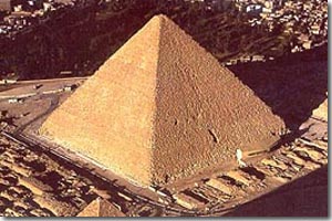 Herodotus was told by his Egyptian guides that it took twenty years for a force of 100,000 oppressed slaves to build the pyramid. Stones were lifted into position by the use of immense machines. The purpose of the structure, according to Herodotus's sources, was as a tomb for the Pharaoh Khufu (whom the Greeks called Cheops). Herodotus claimed that the outer casing was covered with "writing" or "symbols" of a language unknown to the Egyptians. We don't know how much of Herodotus' account we can trust. After all, he wrote 20 centuries after the Pyramid was built. One thing was certainly not true - that the builders were slaves. Archeologists have found the "work camps" of the builders, and they were well provided for. It makes sense - every year the Nile flooded, and for a month or two there was nowhere to live and nothing to do until the waters receeded. So the pharaohs gave the people a home and a job. Current theories center around huge canals, giant ramps, and/or counter-weighted cranes (huge versions of the waterdippers used even today on the Nile). But none of these offer a full explanation for this stupendous engineering feat. New theories concerning the origin and purpose of the Great Pyramid have been proposed . . . astronomic observatories . . . a center of cult worship . . . geometric structures constructed by a long-gone, unknown civilization . . . even extraterrestrial-related theories have been proposed. But there is little evidence for any of these. HOWEVER: At first glance, the sides of the Giza Pyramids, stripped of most of their smooth outer casing during the Middle Ages, look like regular steps. These are actually the courses of backing stones, so called because they once filled in the space between the pyramid core and outer casing. However, a closer examination reveals that the steps are not at all regular. In fact, rather then regular, modular, squared blocks of stone neatly stocked, there is considerable "slop factor", even in the Great Pyramid of Khufu. Not only are the backing stones irregular, they are also progressively smaller toward the top. Behind the backing stones, the core stones are actually even more irregular. We know this because, in the 1830s, Howard Vyse blasted a hole in the center of the south side of Khufu's's Pyramid while looking for another entrance. This wound in the pyramid can still be seen today, and in it, we can see how the builders dumped great globs of mortar and stone rubble in wide spaces between the stones. Here, there are big blocks, small chunks of rock, wedge shaped pieces, oval and trapezoidal pieces, as well as smaller stone fragments jammed into spaces as wide as 8.5 in/22 cm between larger blocks.