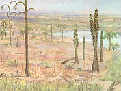 Primitive horsetails, club mosses and 'tree-ferns' (left) turn lifeless land into new habitats for life. (Image: Universe Review) |